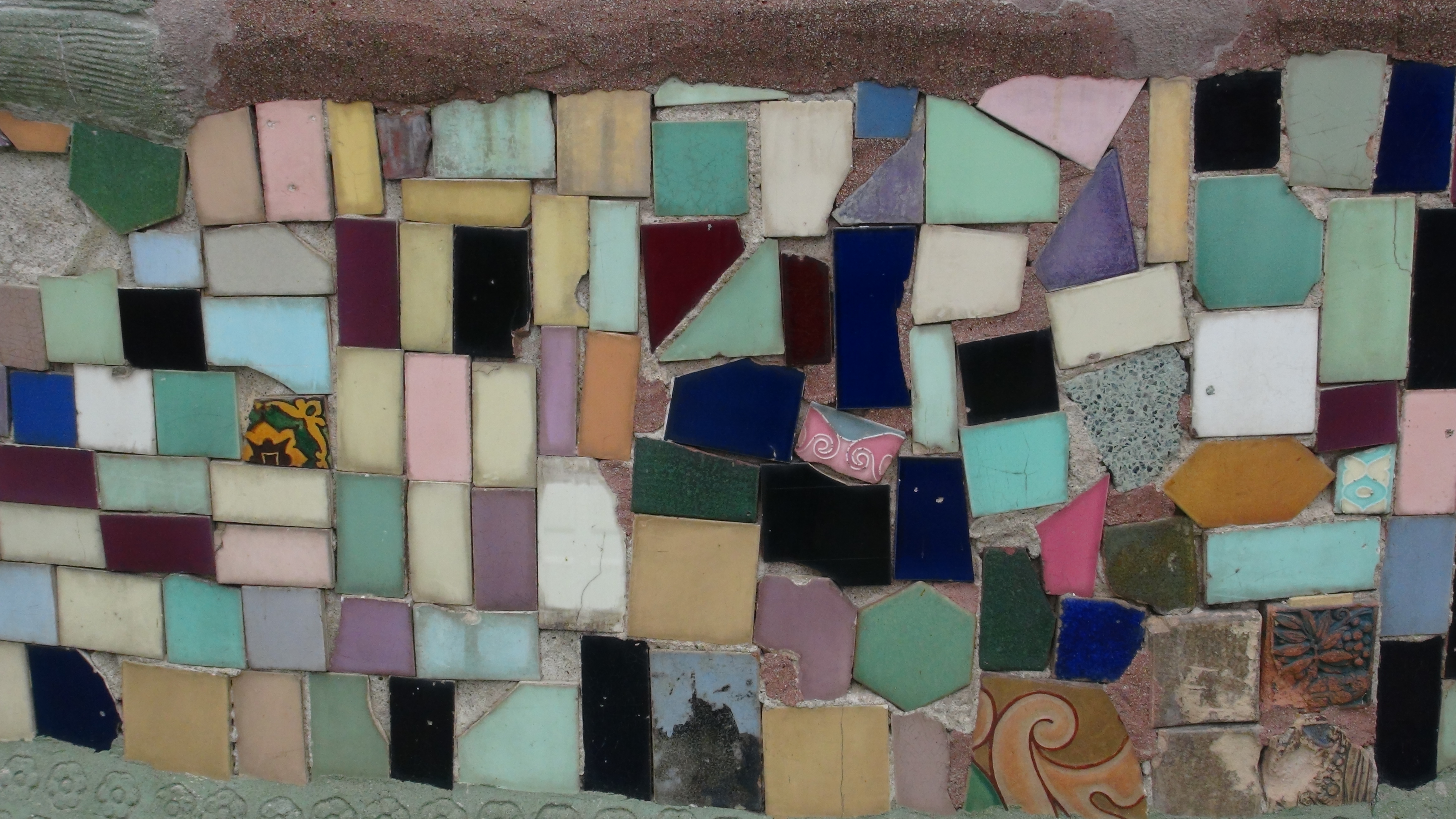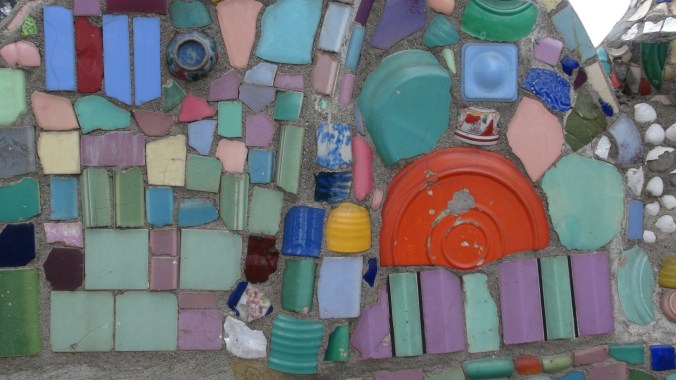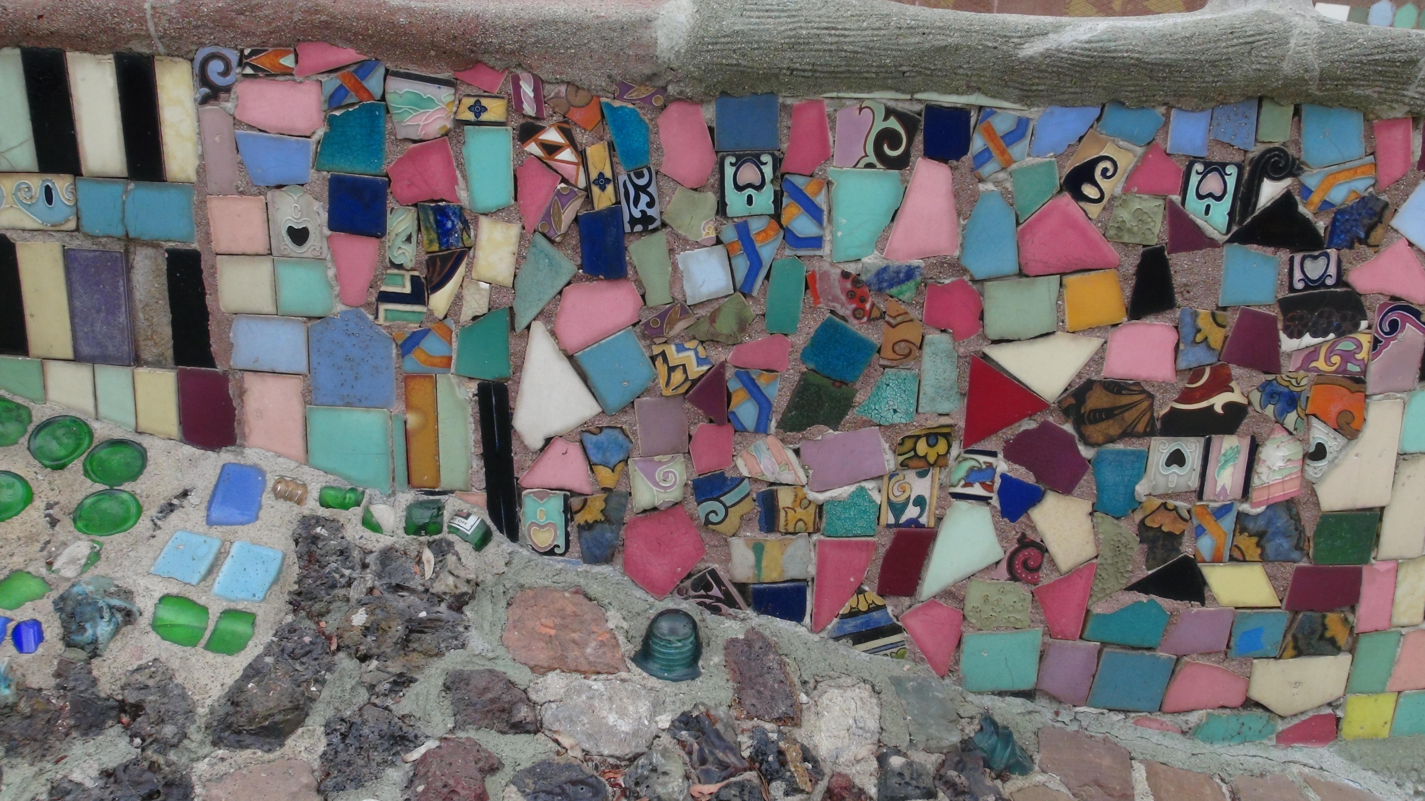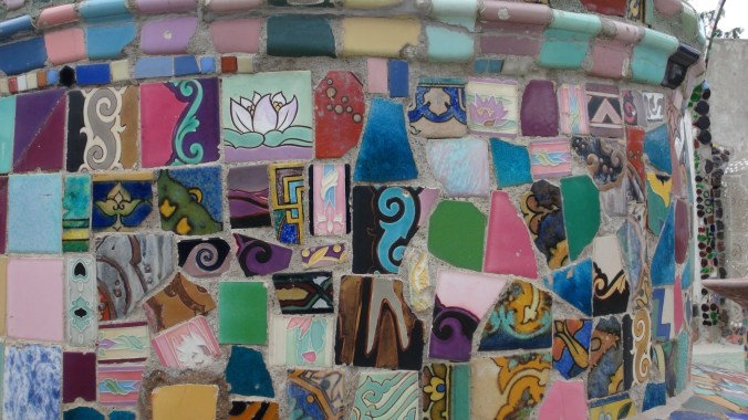 Kids pour through on guided tours. Which is how I got there. The best, and really only, way to give a sense of the exuberant creativity is in the tile work. Embedded bottle glass, tiles, shells, broken plates, concrete reliefs, junk, stuff. It is everywhere. It covers everything.