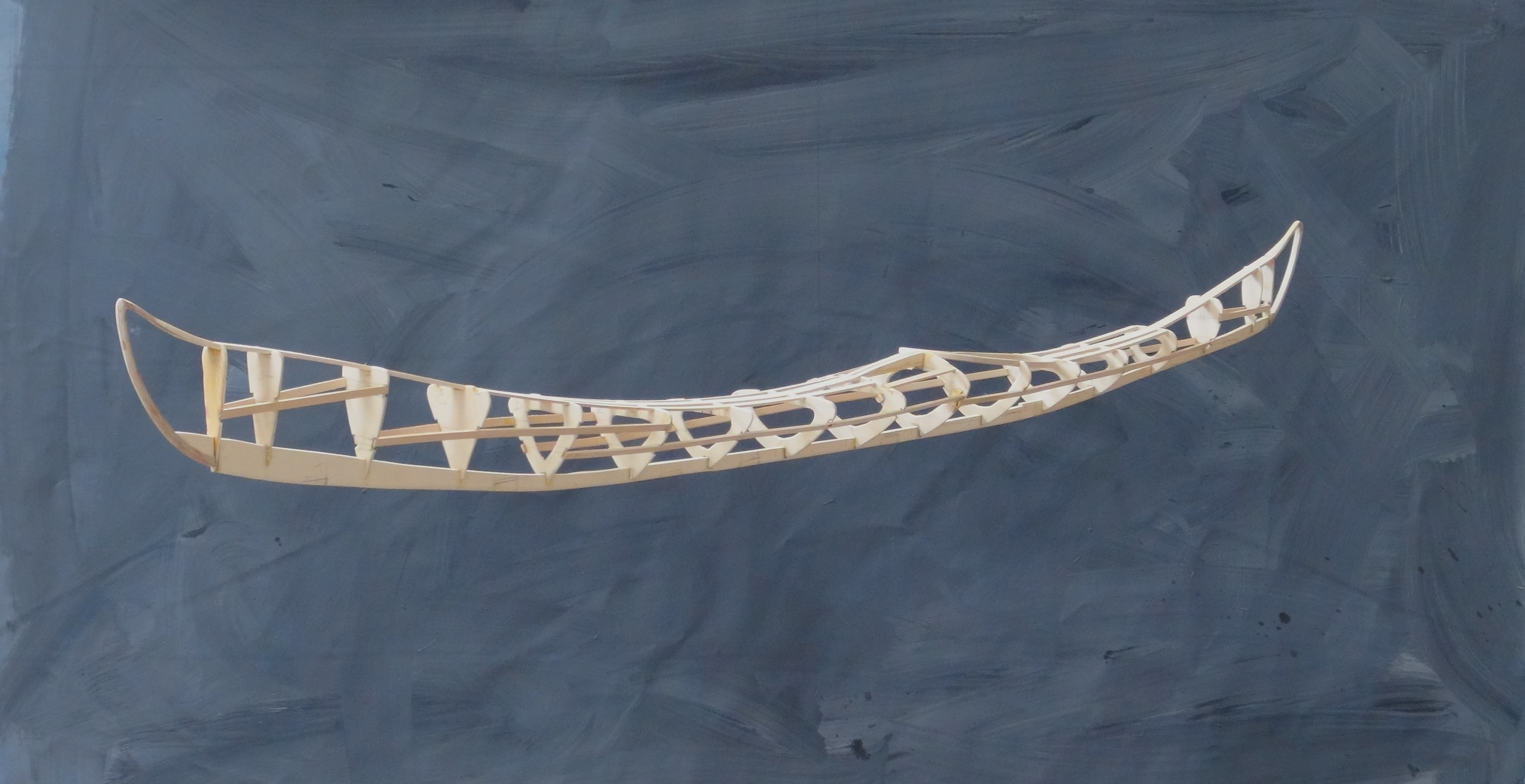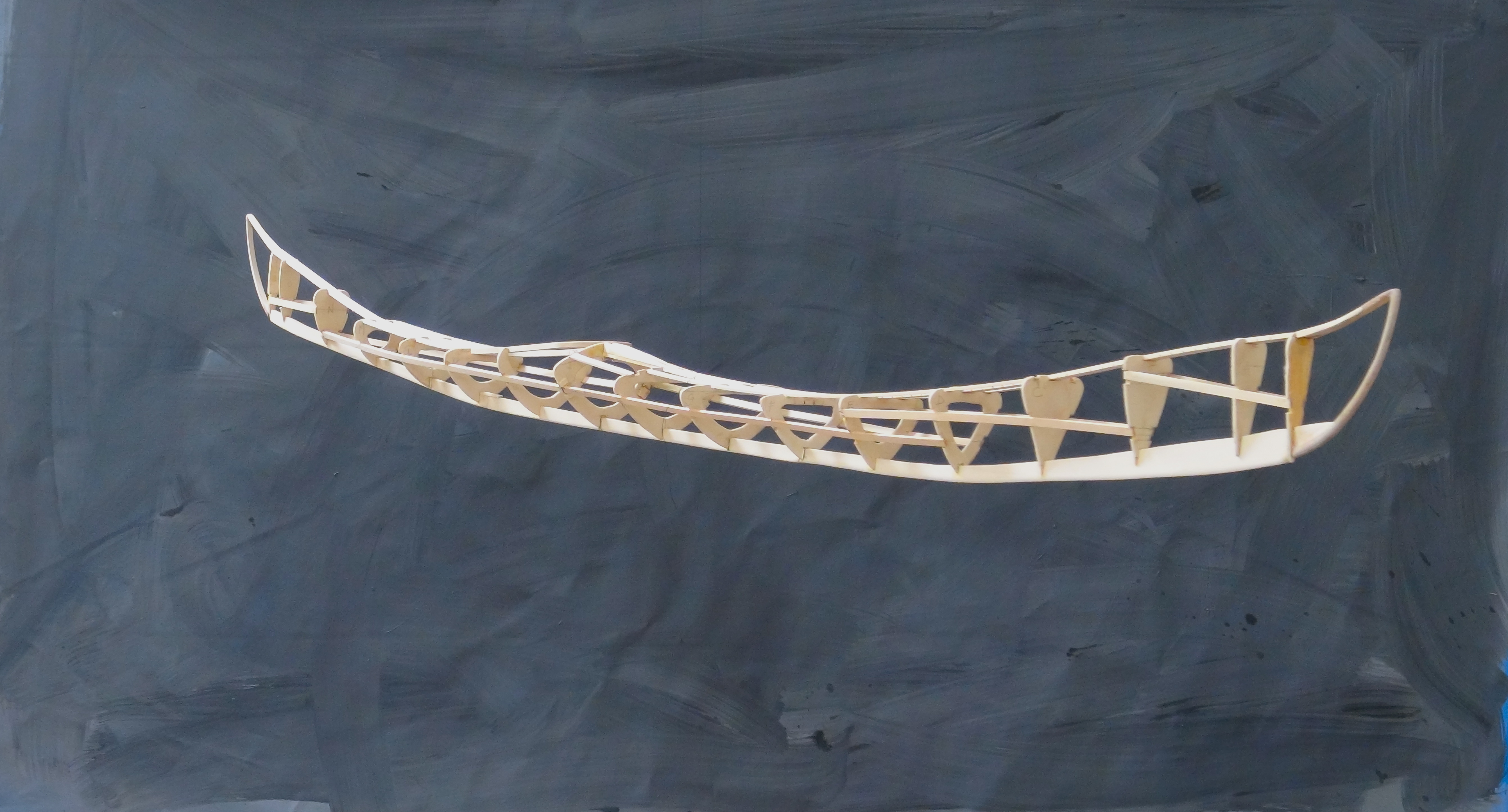 I finished the boat. Or at least the model — 65 inches long. Crafted of 1/8″ birch plywood and basswood and glue. I had intended to cover it. I tried several tests with heat-shrink dacron. I would have had to construct the vessel differently to allow that to work. Then I thought of veneer. Either large pieces or thin strips. I abandoned that too. As it happened the more I looked at the skeleton structure of the vessel the more liked it.